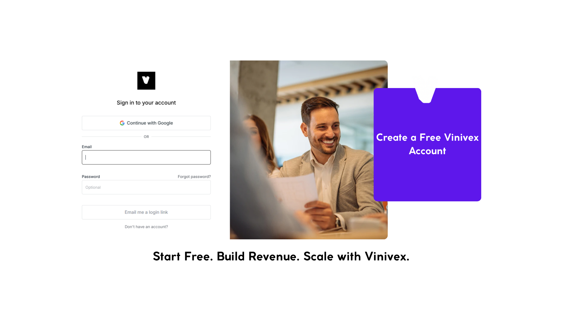 To get started, all you have to do is create a Free Vinivex Account and fill out our Discovery Form so we can better understand your Business/Organizations Goals - from here we’ll have a team member reach out to schedule your first in person meet at our headquarters where we’ll then sit down together and figure out what we can begin doing immediately to start generating more revenue for you and your business.